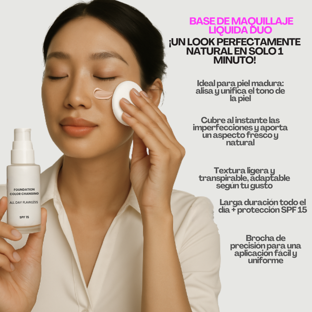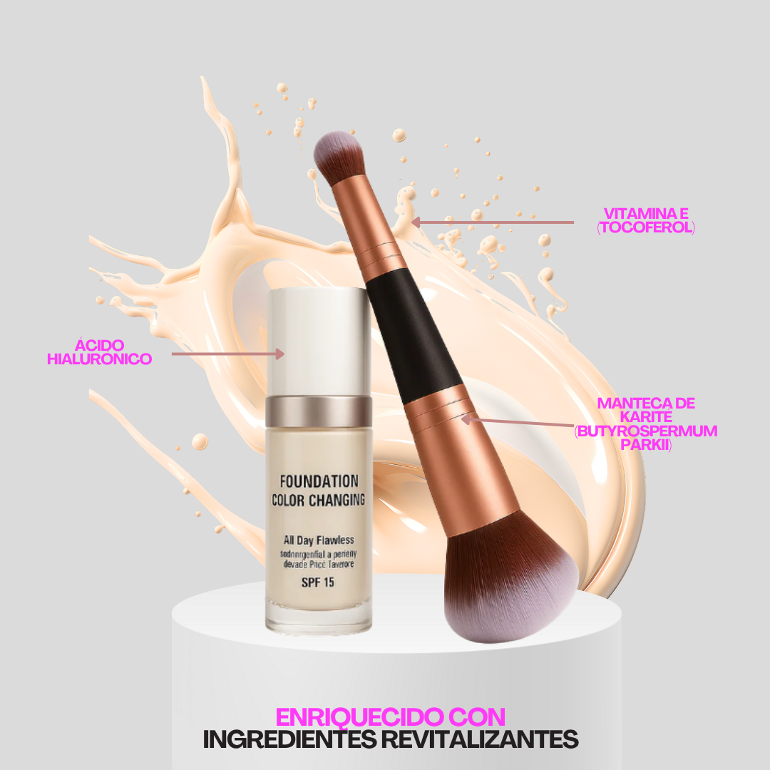 Se adapta a tu tono de pielLa base de maquillaje Changing Foundation se adapta perfectamente a tu tono de piel. Se ha desarrollado especialmente para tonos de piel claros a medios y proporciona una cobertura perfecta y natural que realza tu tez.Disimula las imperfecciones para un aspecto naturalEsta base de maquillaje ligera cubre de forma fiable las rojeces e imperfecciones y deja que brille tu belleza natural. Experimente un brillo radiante como nunca antes.El mejor resultado con una brochaPara obtener resultados óptimos, es mejor aplicar la base de maquillaje con una brocha. De este modo, los pigmentos penetran profundamente en la piel y se minimizan las manchas blancas para un acabado impecable.Piel radiante y uniforme durante todo el díaLa base de maquillaje Changing Foundation es de larga duración: hasta 16 horas. Con su acabado natural y radiante, empezarás cada día llena de confianza en ti misma.Sin poros obstruidosLa sensación sobre la piel de Changing Foundation es agradablemente ligera. Sus ingredientes hidratantes y nutritivos garantizan un aspecto fresco sin obstruir los poros, ideal para el uso diario.